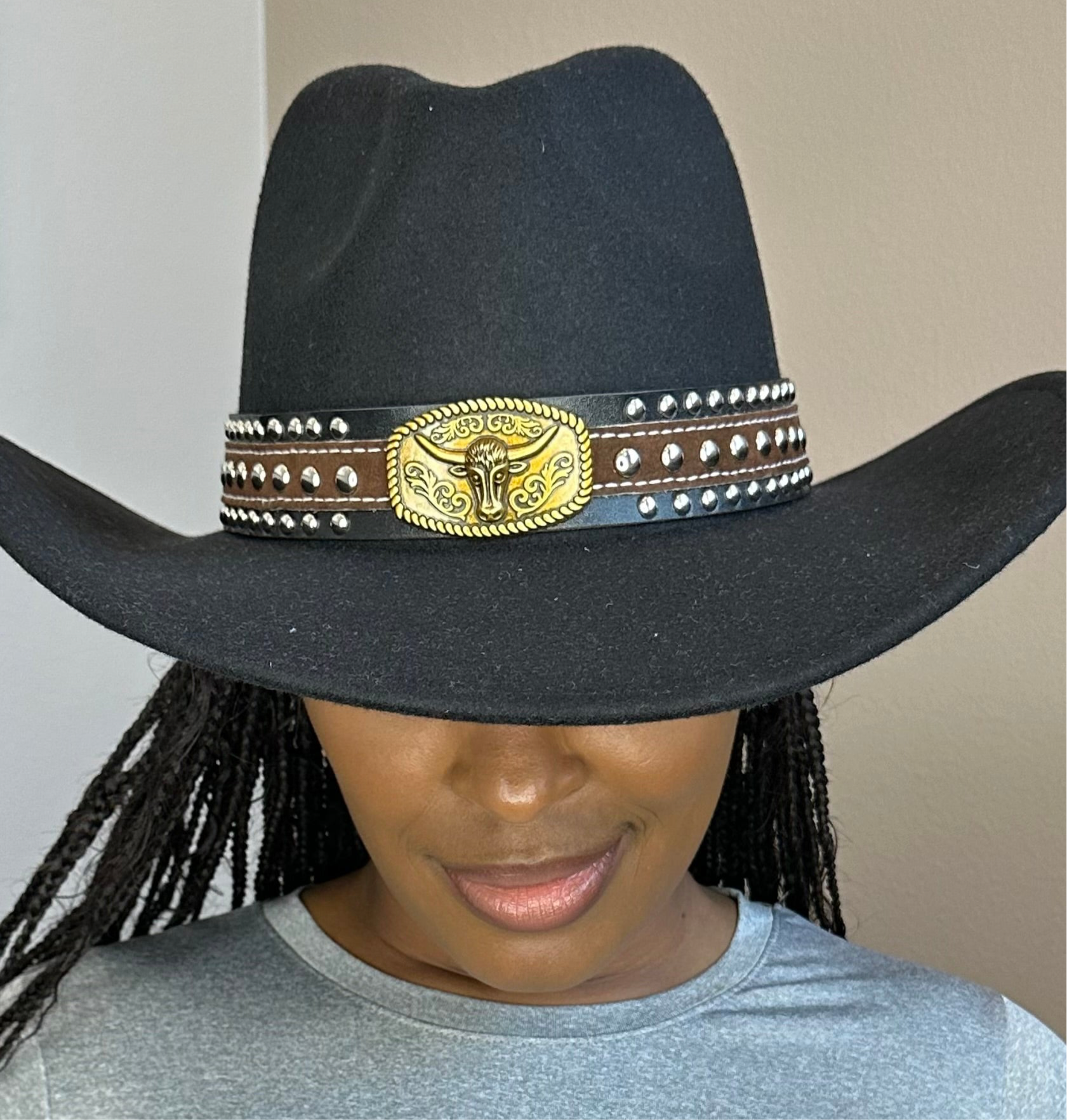 Command the room with the Bronco Buckle Band — where rugged meets refined. This western-inspired hat band features a dual-layer faux leather and suede strap design, adorned with silver-tone studs and contrast stitching. The centerpiece? A striking antique gold buckle engraved with a longhorn bull and ornate scrollwork — the ultimate symbol of strength and southern style.