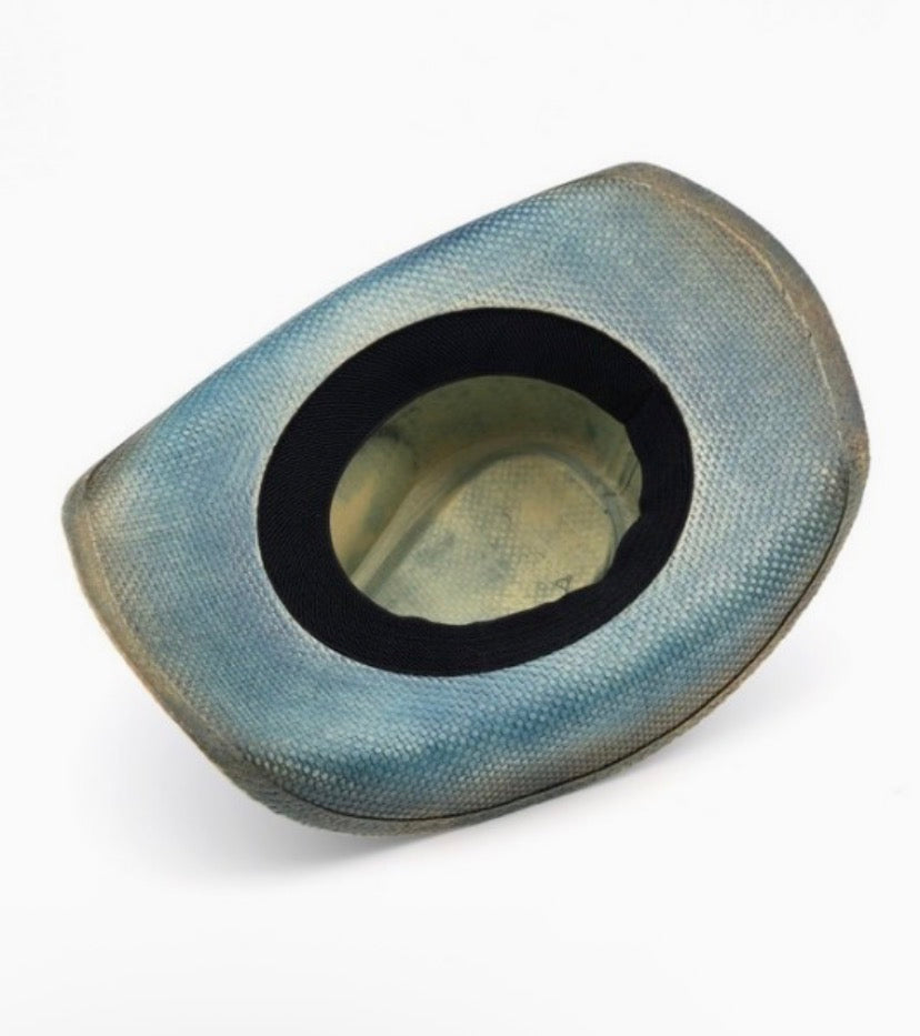 - Distressed Cowboy Hat With Brass-Cplored Eagle Buckle, Braided Rope & Stars.