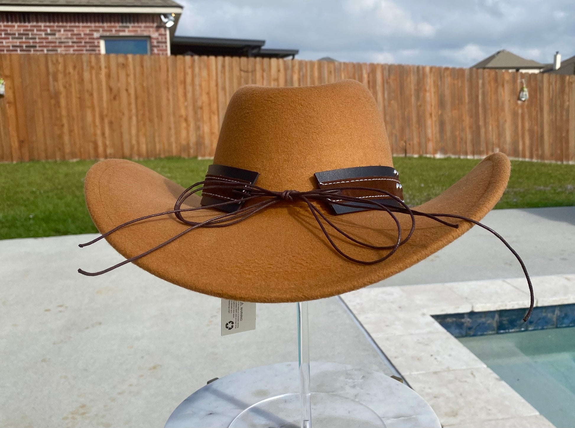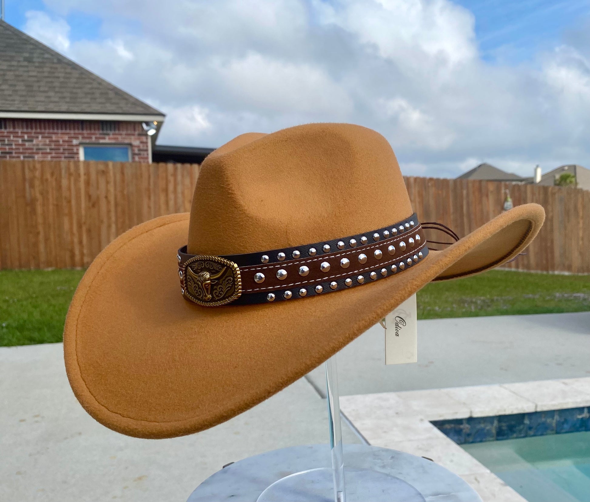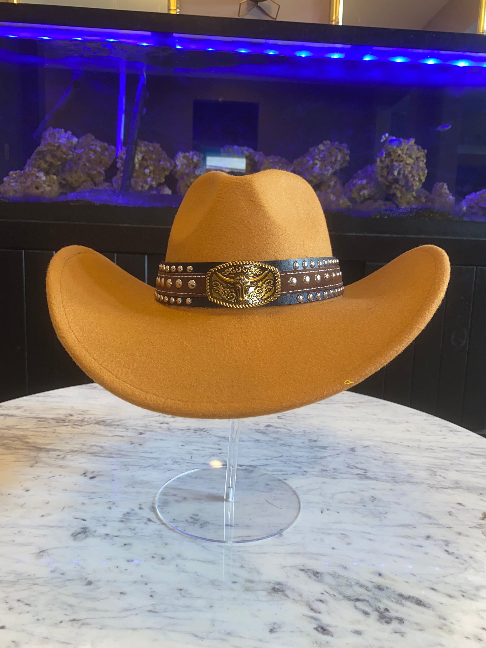 Khaki mustard 58cm cowboy hat with bull band accessory. Hat come with the accessory