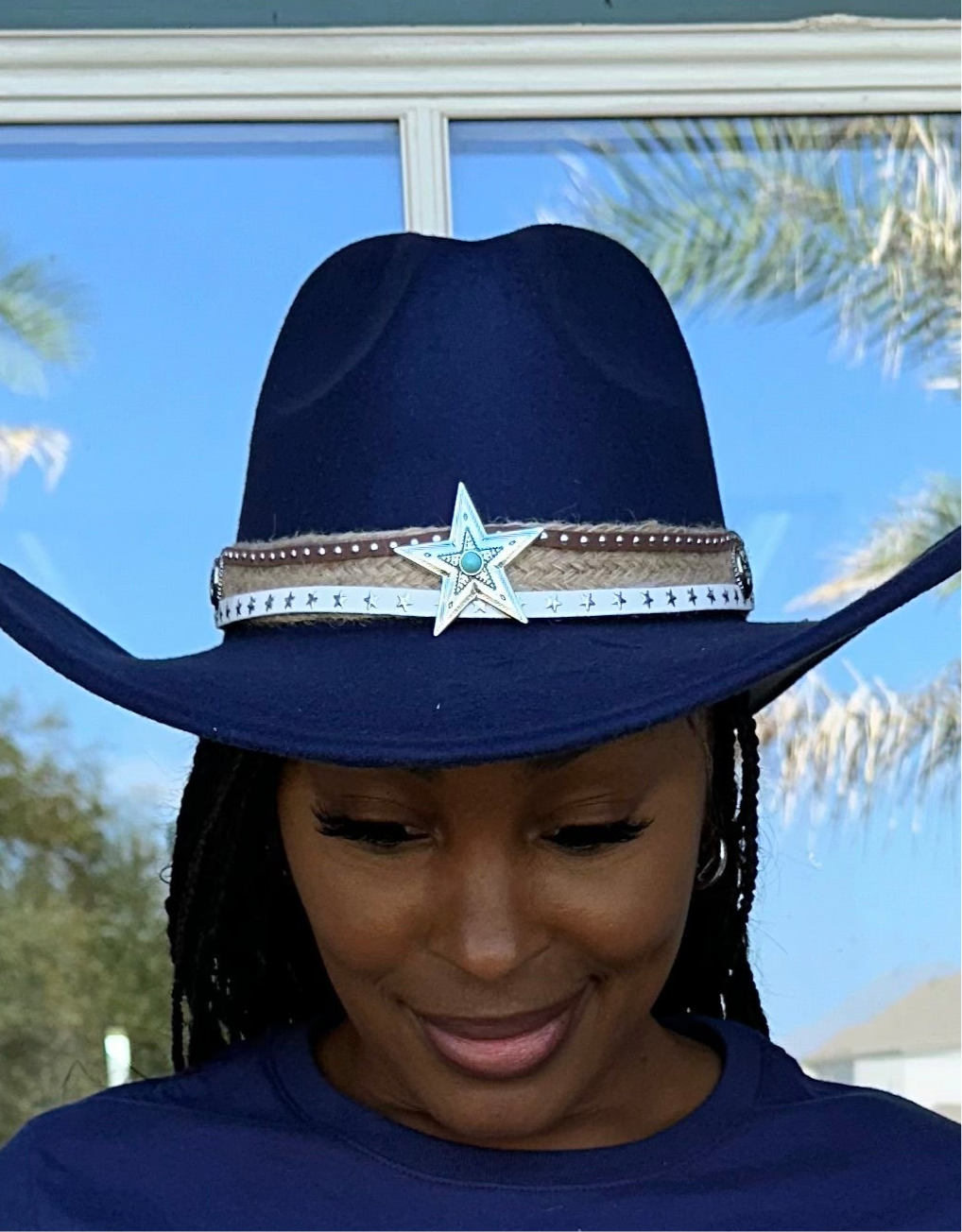 Add a touch of western glam to any hat with our Lone Star Luxe Hat Band. Designed for the bold and stylish cowgirl, this versatile accessory features a stunning silver star centerpiece with a turquoise stone, surrounded by layered textures of jute rope, leather trim, and silver star-studded accents. Whether you’re dressing up a classic fedora or a wide-brim cowboy hat, this band instantly upgrades your look with luxe rodeo flair.